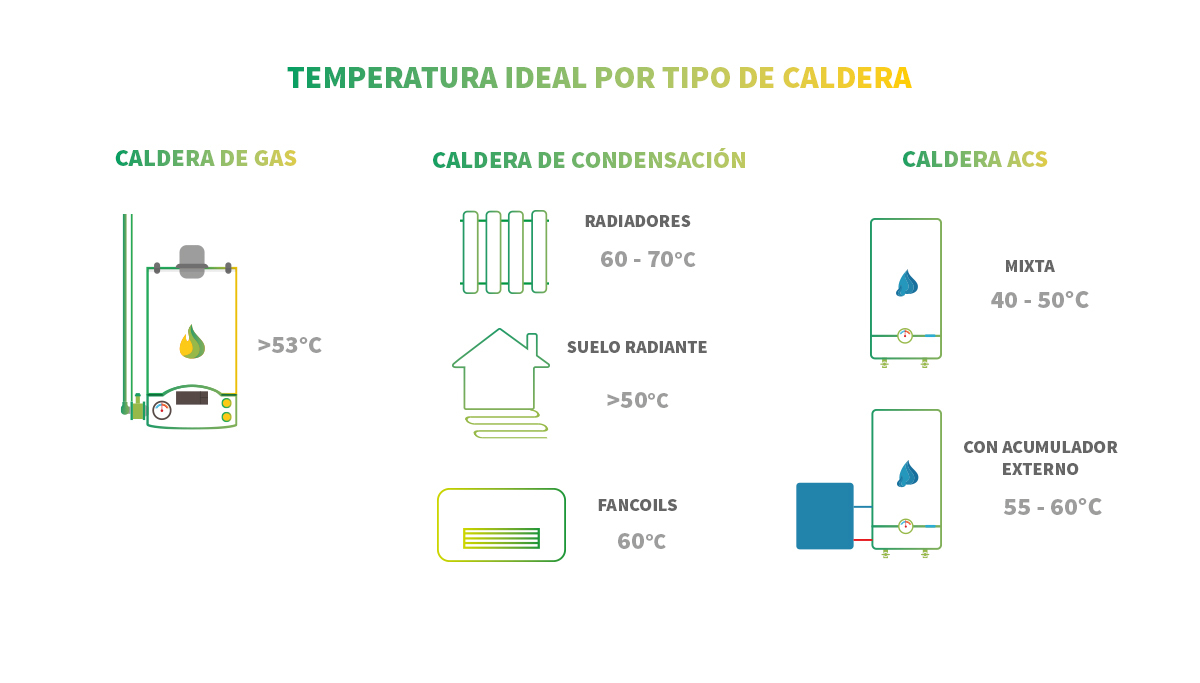 La temperatura ideal de la caldera para el agua caliente sanitaria está entre 40 y 50 °C y sube a 55-60 °C si la caldera tiene acumulador.