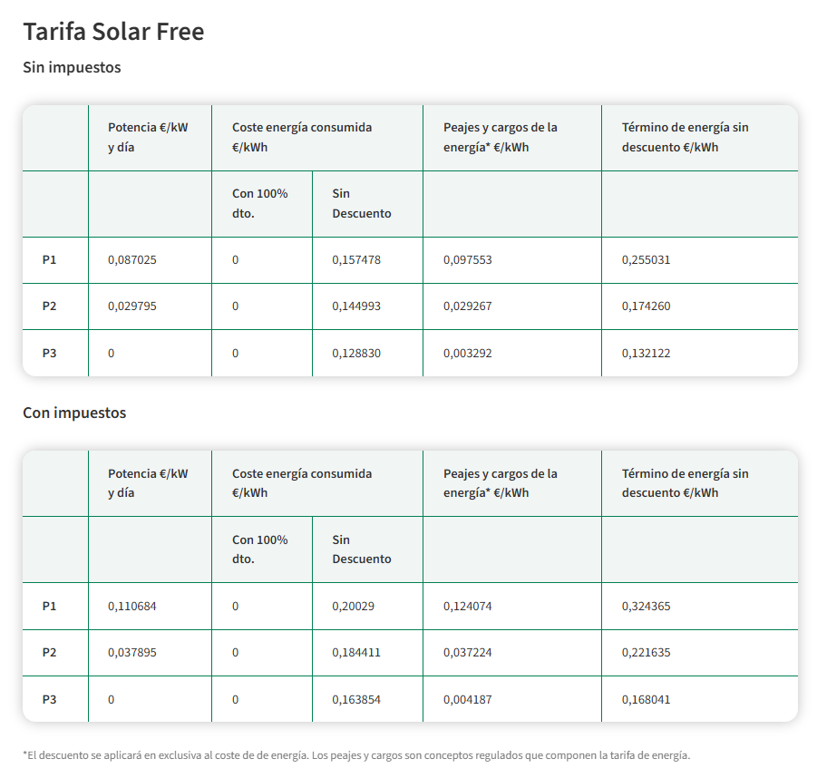 Una vez finalizada tu instalación fotovoltaica, podrás contratar la tarifa promocional Solar Free con un 100% de descuento en el coste de la energía.
